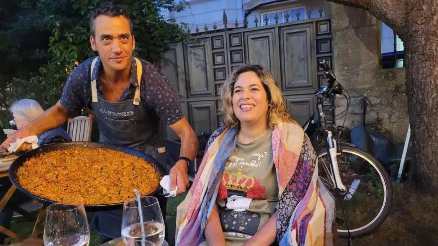 Yayo Daporta y Merchi Álvarez, con una de las paellas que el cocinero preparó el domingo por la noche / A.Martínez