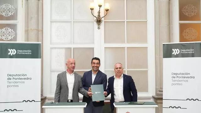 Durán, López y Tourís tras la firma del convenio para la construcción del centro de talasoterapia. / Deputacion Pontevedra
