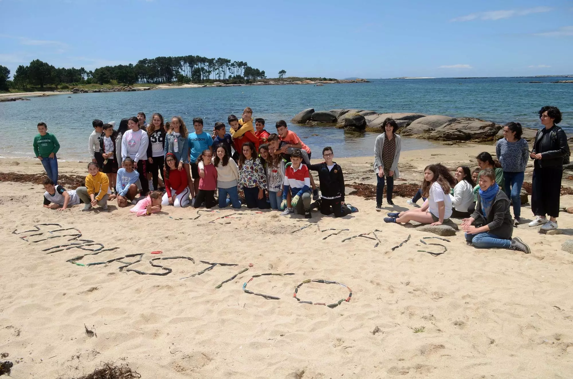 Imagen de archivo de una actividad desplegada por escolares arousanos en la que mostraron un mensaje claro sobre la arena contra los plástico, el cual escribieron utilizando algunos de los tarugos que se habían encontrado. / Noé Parga
