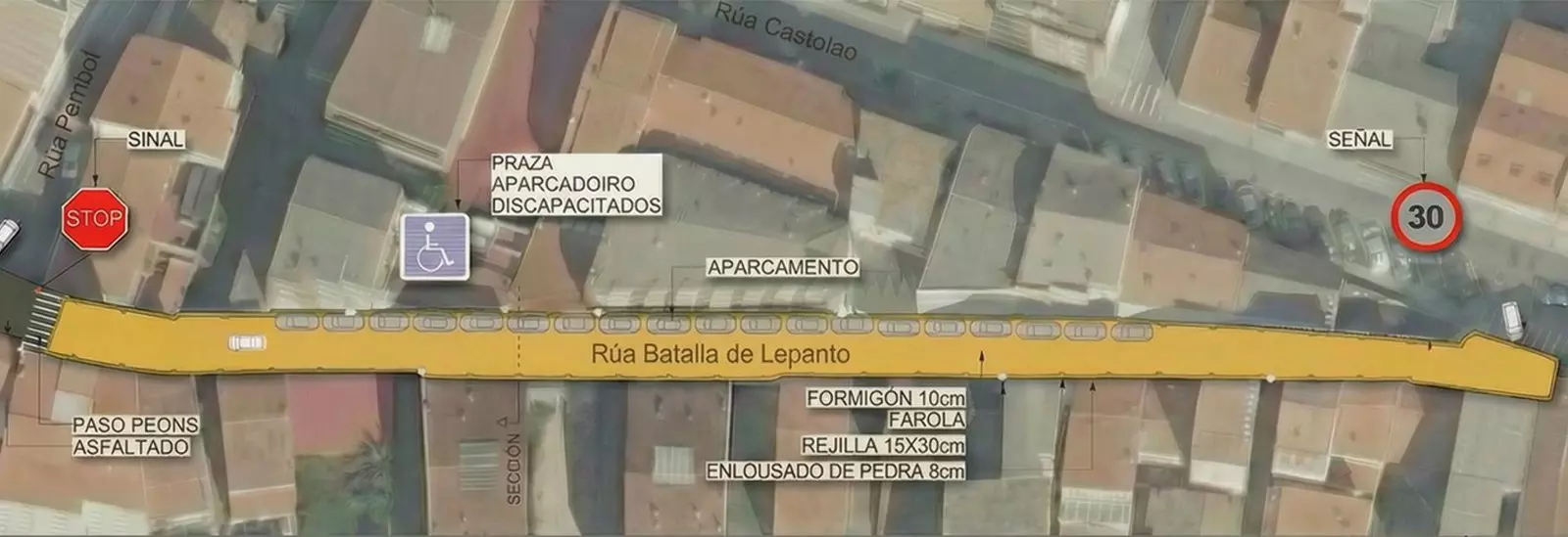 Para más detalle, decir que se actuará en una longitud de 173 metros, sobre una superficie de 893 metros cuadrados, para instalar un pavimento con coexistencia de piedra, renovar red de saneamiento y recogida de pluviales, ejecutar las conexiones a las viviendas, instalar luminarias tipo led y suprimir barreras arquitectónicas.