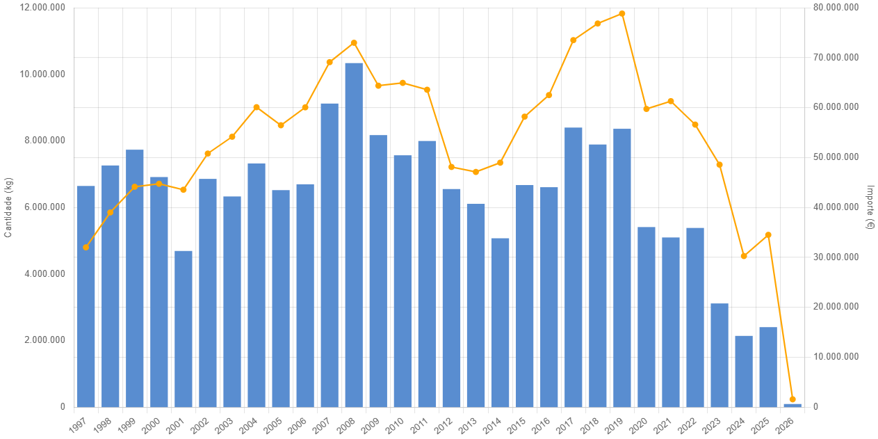 De ahí que las cifras actuales estén a años luz de aquellas 10.338 toneladas que en 2008 marcaban el récord absoluto en cuanto a volumen, desde que en 1997 empezaron a registrarse las operaciones de primera venta en la plataforma tecnológica Pesca de Galicia.