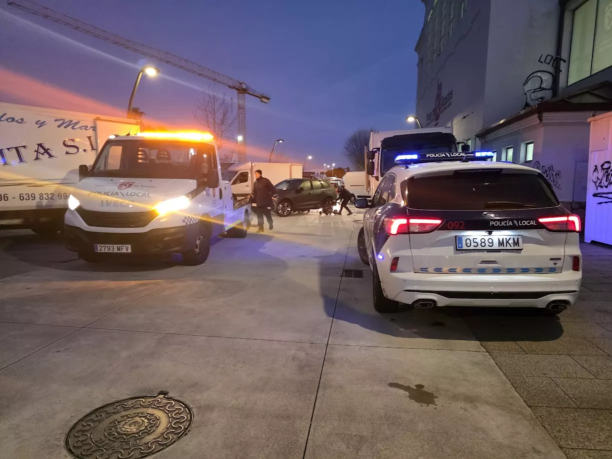 La policía y la grúa llevándose un coche de la zona del mercadillo y la plaza, esta mañana. / M. Méndez