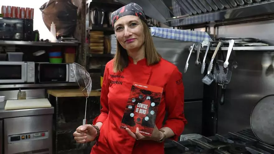 Practicamente coma coser e cantar. Para Raquel Fernández Fernández cociñar e escribir, e facer ben calquera das dúas cousas, non ten moita complicación. “Son procesos creativos que relaciono moito, tamén me gusta debuxar, calcetar...”, explica desde a cociña do restaurante A Taberna do Azafrán de Baiona, que dirixe desde hai cinco anos con éxito. Cinco anos hai tamén que rematou a novela que lle acaba de publicar a Editorial Galaxia, “Contas de buxo” . Unha historia dirixida ao público xuvenil que transcorre entre o Val Miñor e A Mariña Lucense. A presentación oficial será o vindeiro xoves, día 4 de abril, ás 20.00 horas, no local do Instituto de Estudos Miñoráns, en Gondomar.
