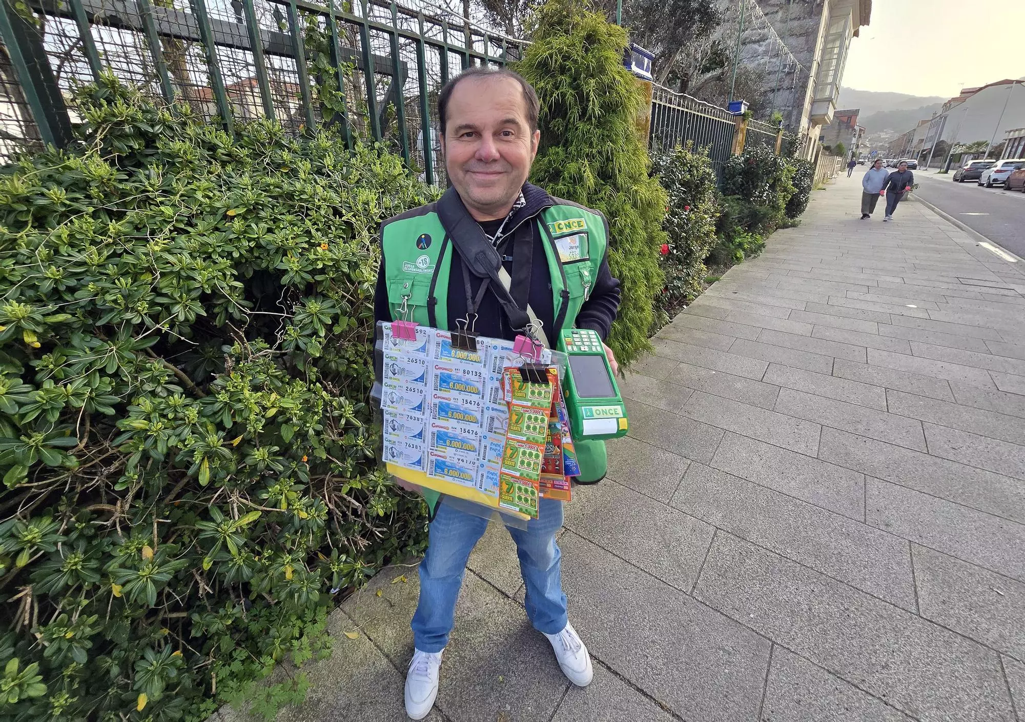 «Encantado» de traer la suerte una vez más a Baiona se mostraba este martes Jorge Giráldez Durán, el vendedor de la ONCE de Sabarís que está en racha. Ha repartido un total de 195.000 euros en el entorno en solo tres días.
