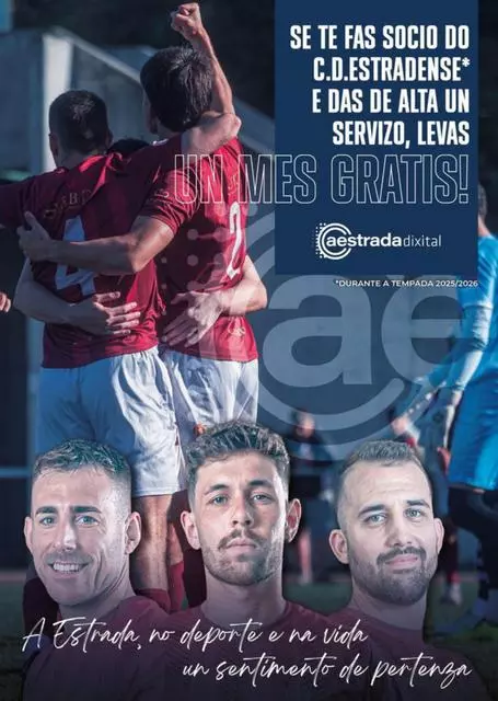 Jugadores como Carabán, Ánder, Miguel, Pichi o Rodri pusieron cara a esta promoción en la que además se busca aumentar la masa social del Estradense. Cabe destacar que el club contó este año a más de 600 socios, una cantidad que supera los registros de los últimos añosy que coloca al club rojillo entre los que más masa social tiene de la Tercera gallega. Con esta promoción de A Estrada Dixital, todos los que se hagan socios del club a lo largo de la temporada 2025/06 y se den de alta en su servicio, tendrán un mes gratis.