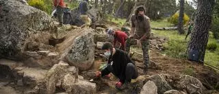 Alfredo González y su equipo, en los días de excavación arqueológica de las chozas que moraban los presos del Valle de los Caídos. / ÁLVARO MINGUITO