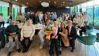 Maruja recibe el ramo de flores de manos de Pena y Troitiño durante la celebración familiar.