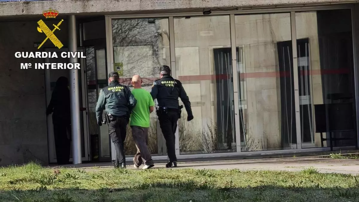 El detenido es conducido a los juzgados de Lalín por dos agentes de la Guardia Civil. / OPC Pontevedra