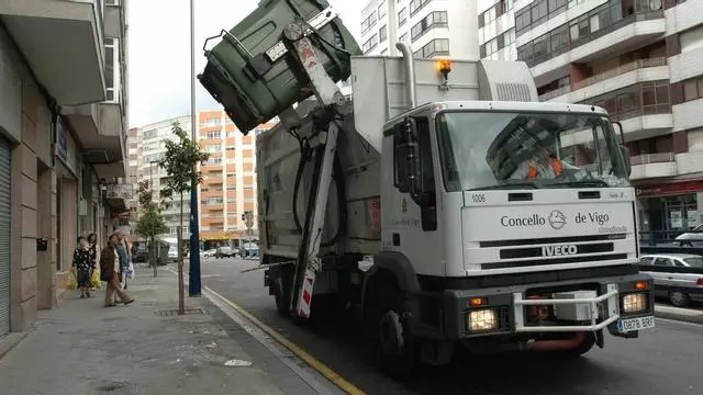 Un camión recoge la basura en Vigo. / RICARDO GROBAS