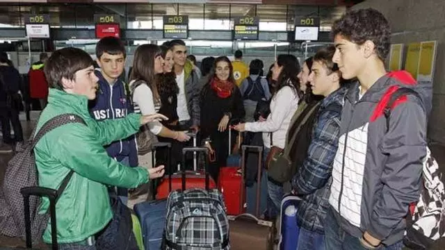 Un grupo de escolares hacen cola para facturar las maletas en el vuelo Vigo-Londres de este año. // M.G.B