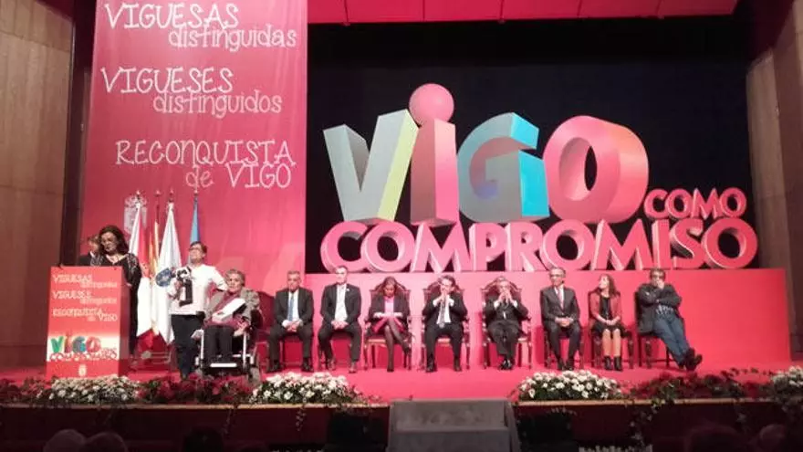 El evento, más allá de conmemorar y reconocer a diferentes entidades y personalidades destacadas de la ciudad, también rindió un emotivo recuerdo a las víctimas de los atentados terroristas de Bruselas y París. Durante la ceremonia recibieron su galardón de Vigués Distinguido la Asociación de Familias de Personas con Parálisis Cerebral-Apamp; Comesaña Sporting Club, entidad que celebra este año su centenario; Down Vigo; astilleros Francisco Cardama; la artista Menchu Lamas; y la junta de personal del Chuvi. Todos ellos recogieron el reconocimiento, salvo Cáritas Diocesana de Tui-Vigo, que ya manifestó la pasada semana que no aceptaría un galardón que en un primer momento el PP había planteado para Red Madre pero que PSOE y Marea declinaron con sus votos la propuesta de los populares.