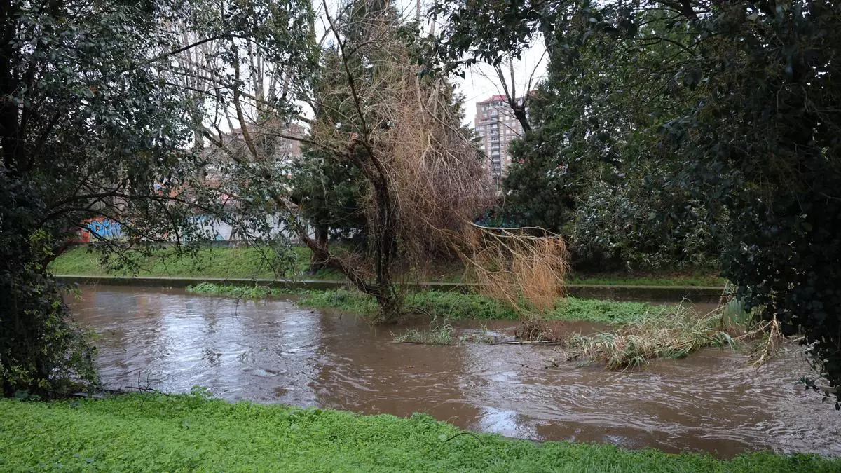 Vista del río Lagares a punto de desbordar a su paso por la avenida de Citroën. / ALBA VILLAR