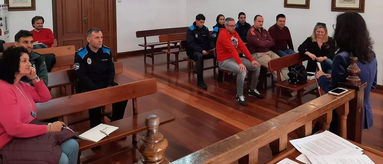 Agentes de policía de la comarca y de la Guardia Civil, ayer en Bueu, en una jornada formativa con la fiscal Carmen Rebolledo. / Julio Santos Álvarez