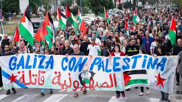 Así concurrieron este miércoles vecinos y colectivos en dos concentraciones frente al consistorio de Cangas y una manifestación que recorrió el centro urbano de la villa con unas 300 personas ondeando banderas y coreando consignas contra el gobierno sionista y su líder Benjamin Netanyahu, así como los estados y líderes políticos que no se han implicado para detener la agresión israelí.