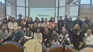 Usuarios de DOA y del Concello, con la ballena realizada por integrantes del Juan XXIII. | SANTOS ÁLVAREZ