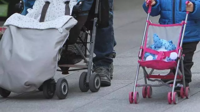 Un adulto porta una silla de bebé y un niño lleva al lado una de juguete. | IÑAKI OSORIO