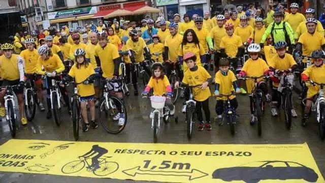 Decenas de aficionados y deportistas, de todas las edades, respondieron al llamamiento y se vistieron la camiseta amarilla con el lema "1,5 metros. Respeta o seu espazo". Mientras ellos lanzaban este mensaje en la plaza de España, a la misma hora se celebraban actos idénticos en Vigo, Noia, Ribeira, A Coruña y Ferrol,
