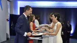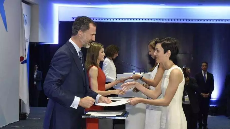 | La joven caldense María Teresa Santos fue seleccionada para cursar los estudios de postgrado a través del programa de "la Caixa", junto con otras compañeras de distintos lugares del España. Esta vecina de Caldas de Reis actualmente realiza un doctorado en Ingeniería e Informática en Estados Unidos. Los Reyes, Felipe VI y Leticia presidieron el acta de entrega de las becas. En la imagen, el Rey le hace entrega del documento de la beca a Teresa Santos.