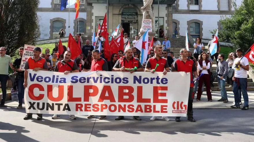 El personal de Veolia Grupo Norte, concesionaria del servicio de mantenimiento del Hospital Provincial de Pontevedra, volvió a concentrarse ayer para reclamar una mejora en las condiciones laborales y salariales, que contemplen guardias, turnos, horario nocturno... Se ha pospuesto la huelga que tenían previsto celebrar ante una posible negociación, pero no las medidas de presión, ya que la concesión termina en diciembre de este año y porque quieren «que se pacten mejoras y se consoliden y sean respetadas por la siguiente empresa que asuma el servicio».