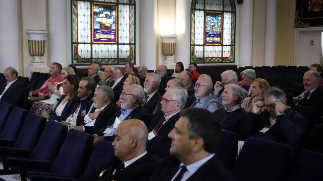 El comandante director de la ENM y anfitrión, Tomás Clavijo Rey-Stolle, acompañó en la mesa e bienvenida al presidente de la Asociación de Ingenieros Navales y Oceánicos de España (AINE), Luis Guerrero Gómez, al ingeniero naval y decano en Galicia de la Asociación y el Colegio de Ingenieros Navales y Oceánicos de España Jorge Dahl de Sobrino.