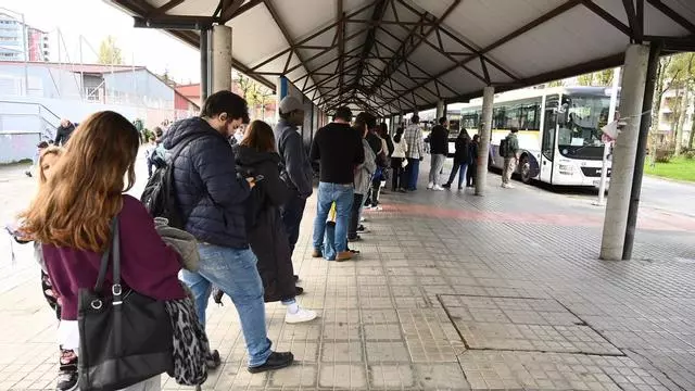Colas de usuarios en la marquesina de la plaza de Galicia para subir al autobús a Marín / Rafa Vázquez