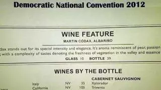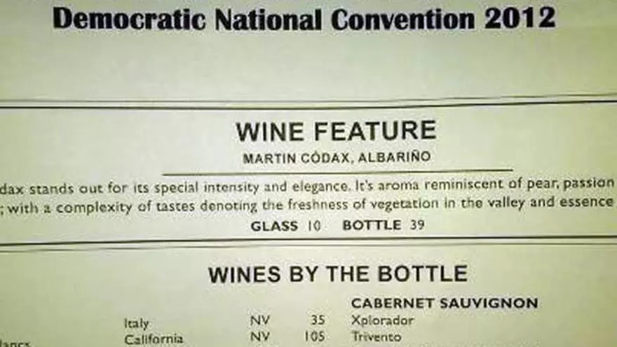 Un vino gallego está presente en una de las cumbres políticas más importantes de mundo y en la que se decidirá el candidato para gobernar EE UU los próximos cuatro años. El albariño "Martín Códax" aparecía ayer en un restaurante de la Convención Demócrata estadounidense como "vino destacado", por sus características.