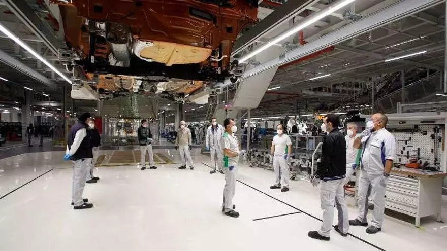 Trabajadores de Volkswagen en Navarra, ayer, tras la vuelta a la actividad del centro. // Efe